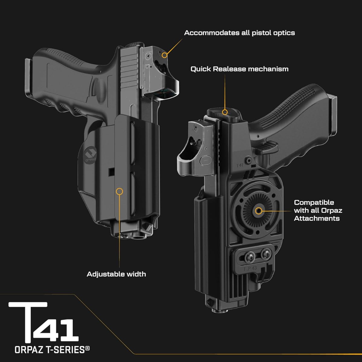 Retención Activa por Pulgar: A diferencia de otros modelos Orpaz que usan el dedo Ãndice, la T41 suele emplear una palanca de liberación accionada por el pulgar. Esto se considera más seguro para evitar descargas accidentales al desenfundar bajo estrés.